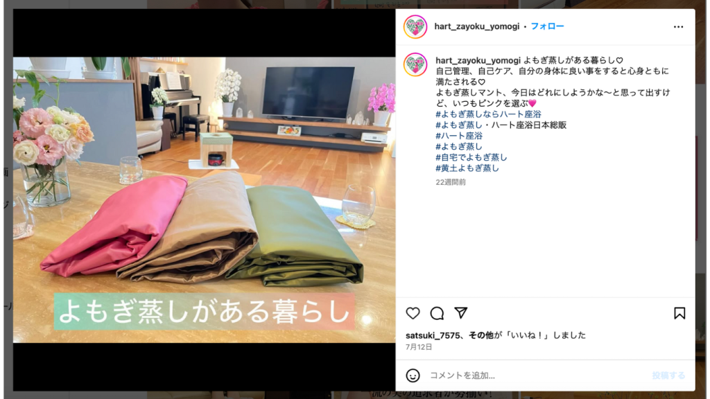 ちなみによもぎ蒸し用のハーブはたくさん売っているけれど、雑誌でも紹介されているハート座浴さんのよもぎ蒸しがおすすめ。