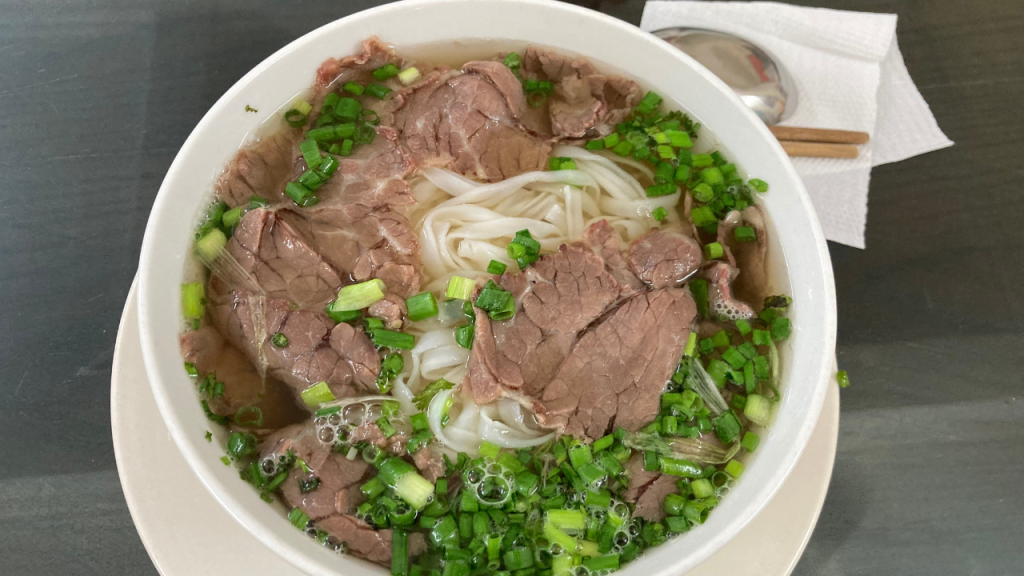 ハノイのフォーは、澄んだスープにたっぷりのハーブと薄切り肉が入っていて、シンプルながらも深い味わい。出汁がしっかり効いたスープが体に染み渡ります。