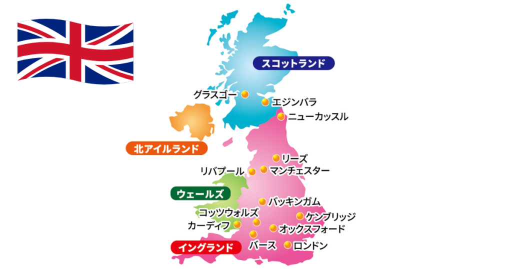 「イギリス(UK)」は正式には「グレートブリテンおよび北アイルランド連合王国」といい、イングランド、スコットランド、ウェールズ、北アイルランドの4つの地域で成り立っています。