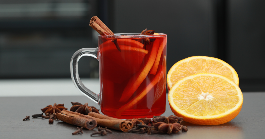 - シナモンスティックとクローブを加えて香りを移し、最後に輪切りレモンを浮かべれば完成!
